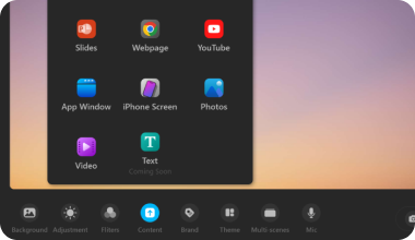 The simple and best way to get layout, background, lens style and present your content by using different free themes. Quickly start your video call, online course, product demo and tutorial recording, etc.